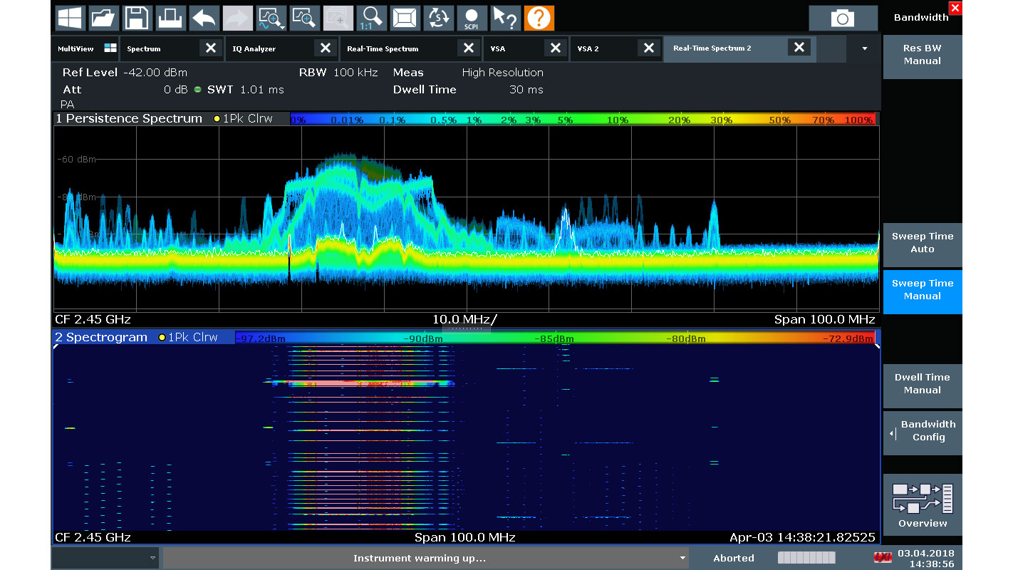 用户可以使用FSW实时选件在高达800 MHz的带宽中可靠检测纳秒级极短偶发干扰信号,即使接近强力载波时也同样如此。实时频谱分析有助于用户分析现有跳频算法并创建替代算法,以防止相同频段内符合不同标准的信号之间发生冲突。